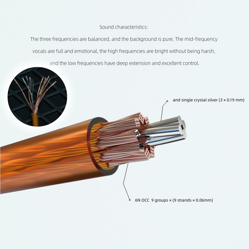 A02 features 6N OCC + single-crystal silver material with a Litz structure, delivering a pristine background. Midrange vocals are rich and expressive, high frequencies are bright yet smooth, while low frequencies exhibit deep extension and exceptional control.