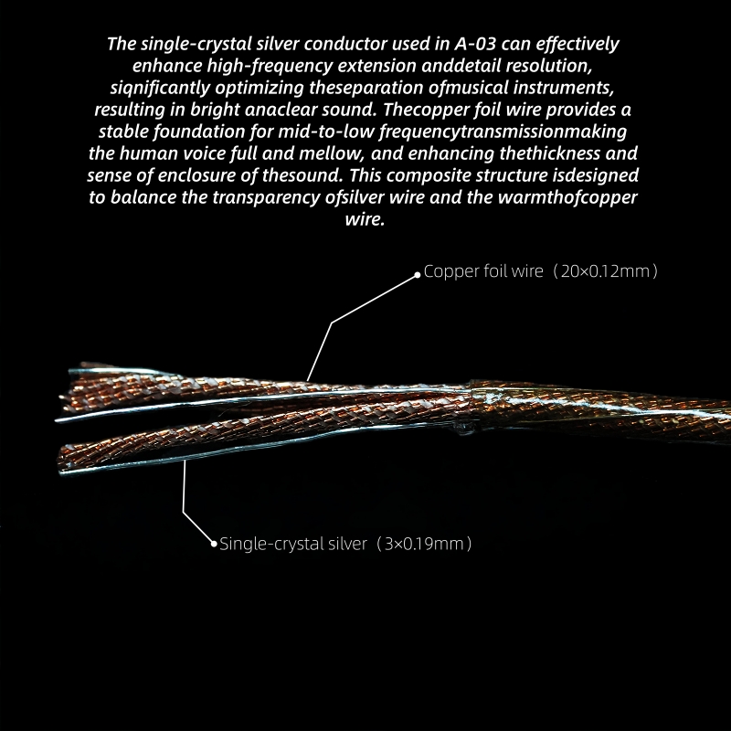 A-03 is an earphone upgrade cable that utilizes a composite conductor structure of single-crystal silver and copper foil. It aims to blend the high-frequency resolution of silver wires with the mid-to-low frequency warmth of copper wires, achieving a high-level balance between high transparency, a wide soundstage, and rich, full vocals. In short, it's an upgrade cable pursuing “all-around” performance, allowing users to avoid the difficult trade-off between “technical quality” and “listening experience.”