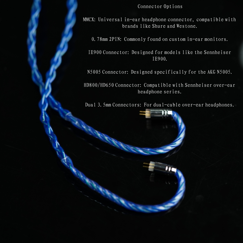 Connectors: Optional MMCX / 0.78mm 2PIN / IE900 interface / N5005 interface / HD800 interface / HD650 interface / dual 3.5mm interfaces, etc., widely compatible with various high-end over-ear headphones and in-ear headphones.