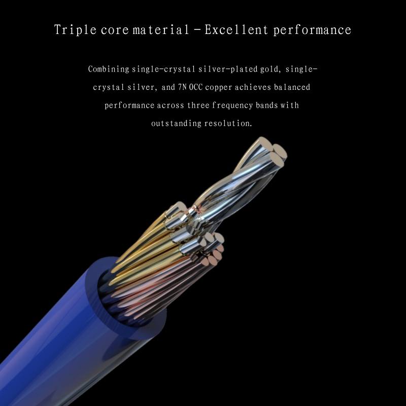 P01 employs gold-plated single-crystal silver and a combination of single-crystal silver with 7N OCC, achieving balanced performance across three frequency bands with outstanding resolution.