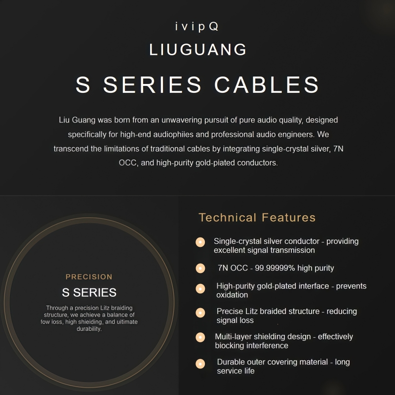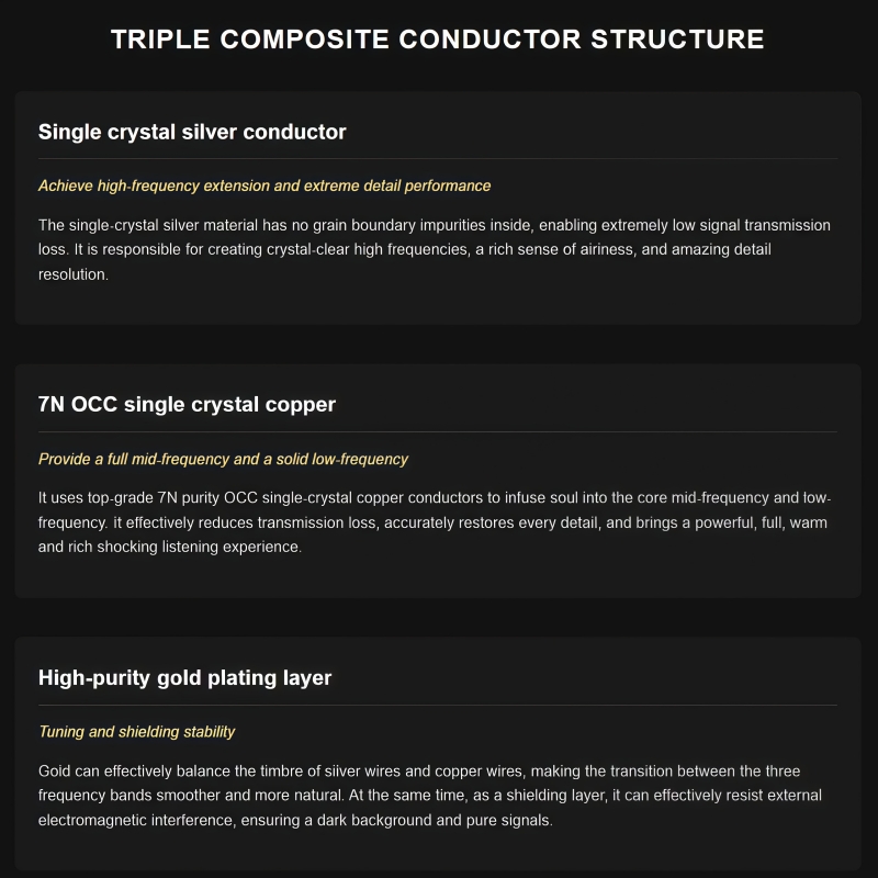 5. Conductor Structure: Single-crystal silver (3×0.19 mm) + 7N OCC (30×0.08 mm) + High-purity gold-plated core (13×0.10 mm)