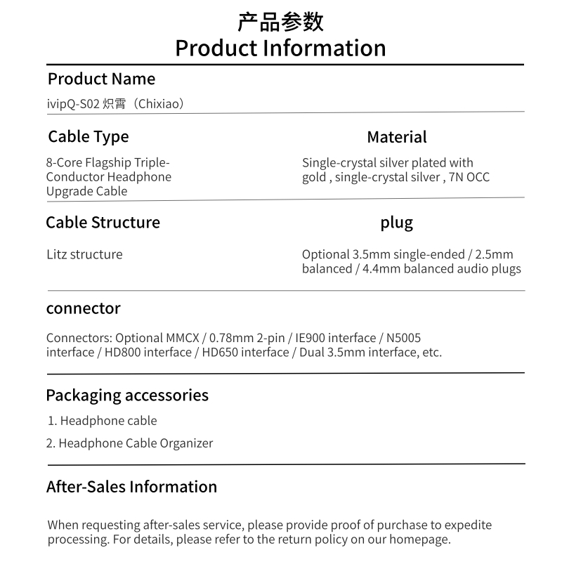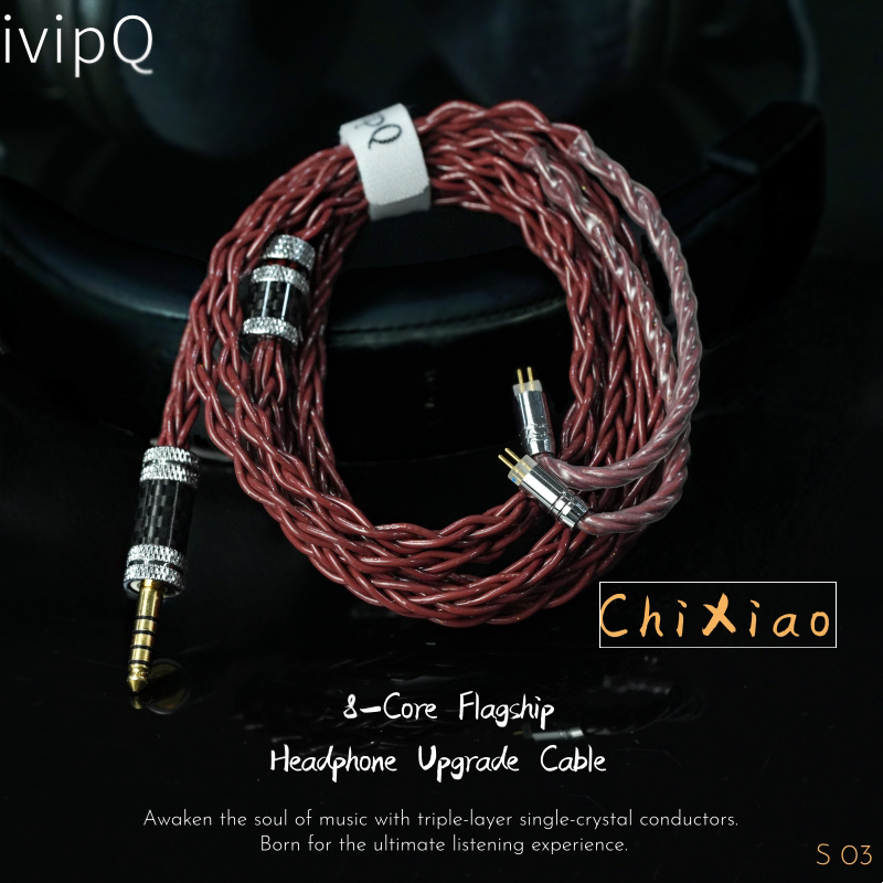 ivipQ-S03, as an 8-core flagship cable, utilizes single-crystal silver-plated gold, single-crystal silver, and 7N OCC materials. Soundstage performance: expansive and three-dimensional with precise localization and rich layering. A wide range of plug and connector options ensures perfect compatibility with various high-end over-ear and in-ear headphones.